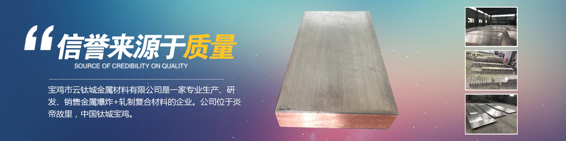 寶雞市云鈦城金屬材料有限公司是一家專(zhuān)業(yè)生產(chǎn)、研發(fā)、銷(xiāo)售金屬爆炸+軋制復(fù)合材料的企業(yè)。公司位于炎帝故里,中國(guó)鈦城寶雞。公司生產(chǎn)設(shè)備齊全、擁有位置優(yōu)越的爆炸焊接生產(chǎn)基地,具備了大規(guī)模、高效率實(shí)施爆炸焊接的硬件基礎(chǔ),可滿(mǎn)足客戶(hù)對(duì)各類(lèi)大幅面金屬?gòu)?fù)合材料的需求。